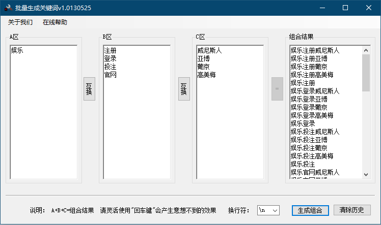 如上图,我只使用了A+B就足够了,如果需要大量的长尾词,那么就可以使用A+B+C的格式,得到更多的长尾词,这里大家自行测试使用!