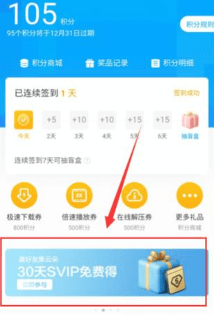 1、打开百度网盘APP->我的积分->进去签到即可->连续签到7天必中->下面中间页面轮播图